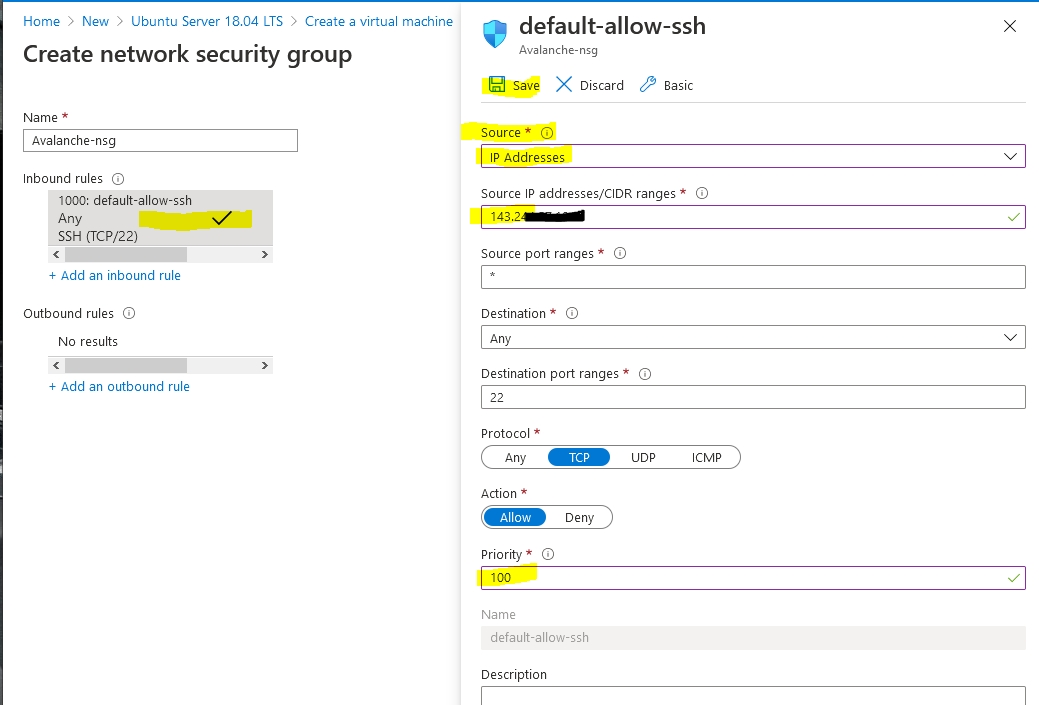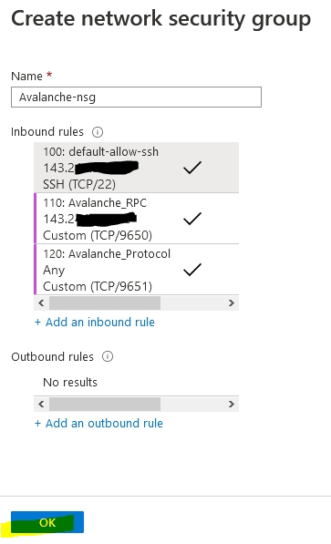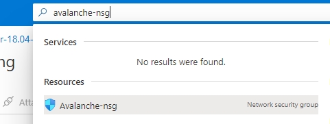 REMARQUE: Si vous devez modifier les règles du groupe de sécurité réseau après le déploiement si votre adresse IP domestique a changé, recherchez «avalanche-nsg» et vous pouvez modifier la règle pour SSH et le port 9650 avec la nouvelle adresse IP. Le port 9651 doit rester ouvert à tous, car c'est ainsi qu'il communique avec les autres nœuds Avalanche.
