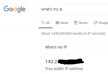 Pour des raisons de sécurité, vous souhaitez restreindre les personnes autorisées à se connecter à distance à votre nœud. Pour ce faire, vous voudrez d'abord savoir quelle est votre adresse IP publique existante. Cela peut être fait en accédant à Google et en recherchant "quelle est mon adresse IP".