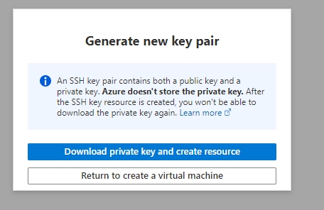 Vous devriez alors recevoir une invite vous demandant de générer une nouvelle paire de clés pour connecter votre machine virtuelle. Sélectionnez “Download private key and create resource” pour télécharger la clé privée sur votre PC.
