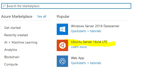 Sélectionnez Ubuntu Server 18.04 LTS (ce sera normalement dans la section "popular" ou recherchez-le sur le marché)
