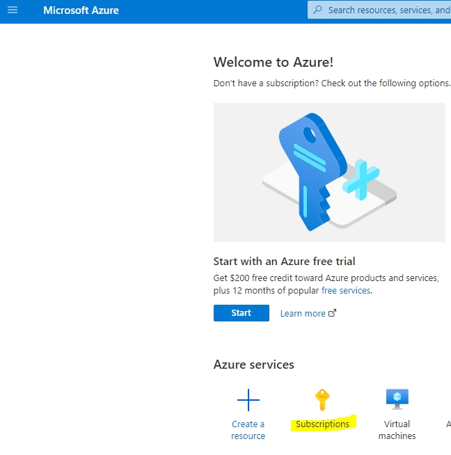 Une fois que deux facteurs ont été configurés, connectez-vous au portail Azure en accédant à https://portal.azure.com et en vous connectant avec votre compte Microsoft. Lorsque vous vous connectez, vous n'avez pas d'abonnement, nous devons donc en créer un au préalable. Sélectionnez “Subscriptions” comme indiqué ci-dessous: