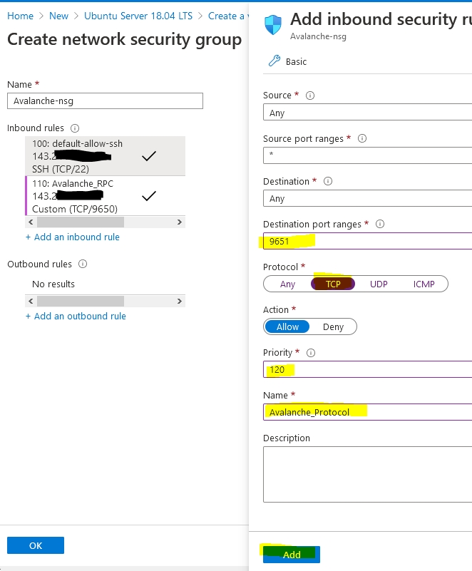 Sélectionnez “+ Add an inbound rule” our ajouter une règle finale pour le protocole Avalanche afin que d'autres nœuds puissent communiquer avec votre nœud. Cette règle doit être ouverte à tous, alors gardez «Source» sur “Any”. Changez la plage de ports de destination sur «9651» et changez le protocole sur «TCP». Entrez une priorité de 120 et un nom de Avalanche_Protocol et appuyez sur "Add".