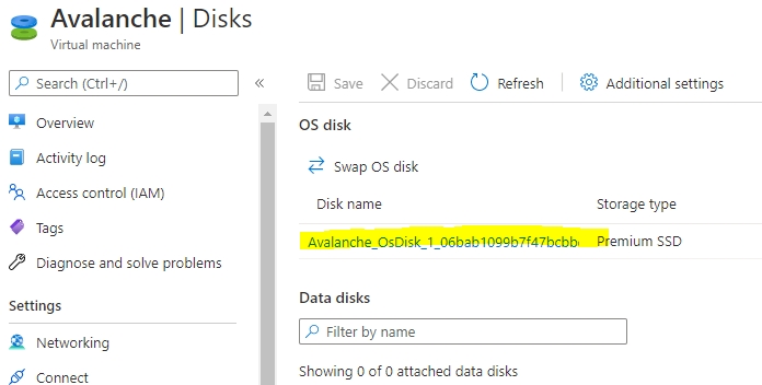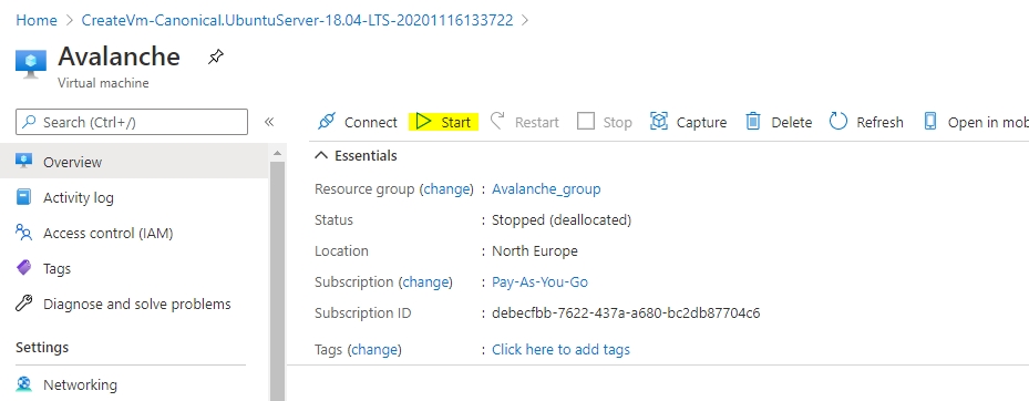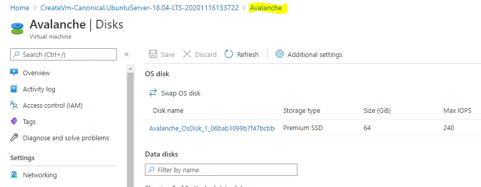 Faire cela maintenant étendra également la partition automatiquement dans ubuntu. Pour revenir à la page de présentation de la machine virtuelle, sélectionnez Avalanche dans les paramètres de navigation.