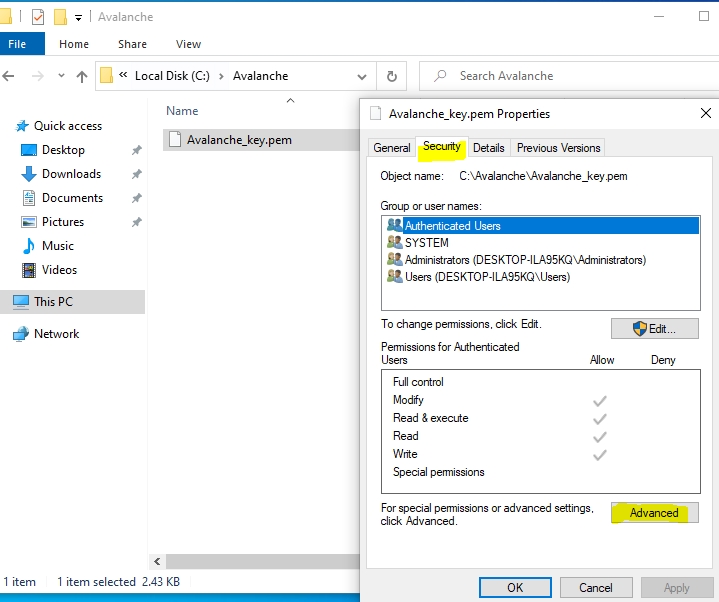 Sur votre PC local, créez un dossier à la racine du lecteur C: appelé Avalanche, puis déplacez le fichier Avalanche_key.pem que vous avez téléchargé précédemment dans le dossier. Cliquez ensuite avec le bouton droit sur le fichier et sélectionnez Propriétés. Accédez à l'onglet de sécurité et sélectionnez «Avancé» en bas