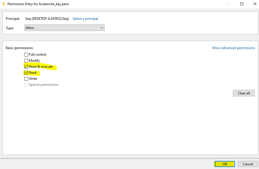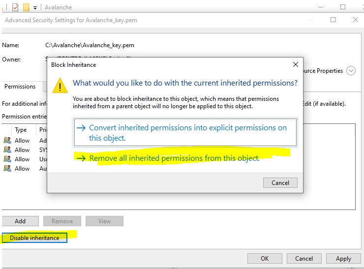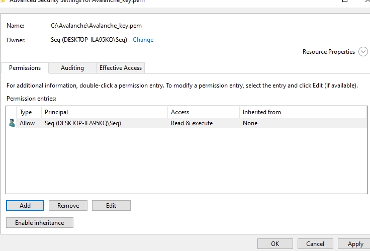 Cela devrait ressembler à quelque chose comme ci-dessous, sauf avec un nom de PC / un compte d'utilisateur différent. Cela signifie simplement que le fichier de clé ne peut être modifié ou accessible par aucun autre compte sur cette machine à des fins de sécurité afin qu'ils ne puissent pas accéder à votre nœud Avalanche.