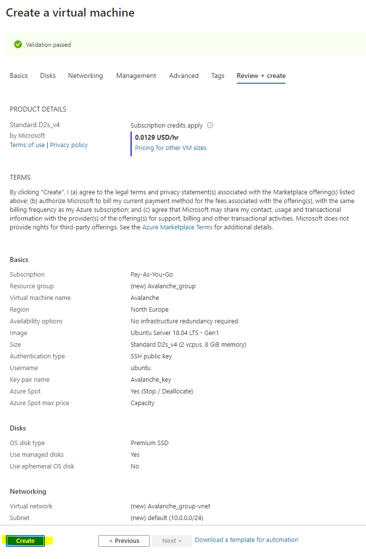 Il effectuera d'abord un test de validation. Si vous recevez une erreur ici, assurez-vous d'avoir sélectionné le modèle d'abonnement Pay-As-You-Go et que vous n'utilisez pas l'abonnement d'essai gratuit car les instances Spot ne sont pas disponibles. Vérifiez que tout semble correct et appuyez sur “Create”