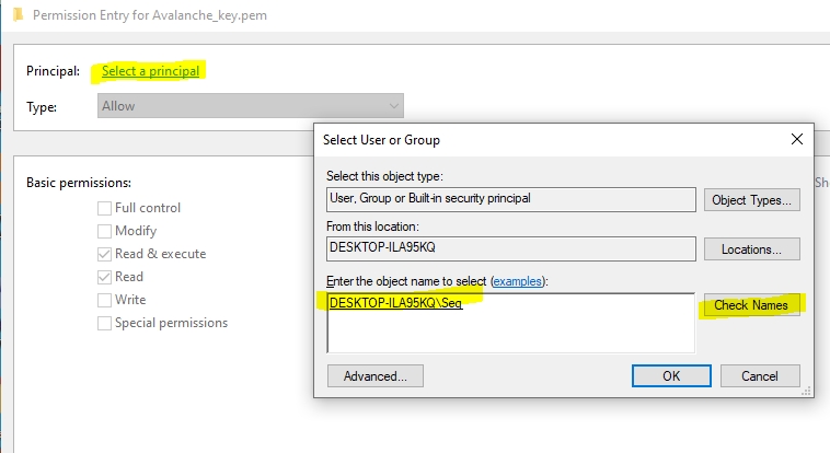 Sélectionnez ensuite «Ajouter» pour ajouter une nouvelle autorisation et choisissez «Sélectionner un mandant» en haut. Dans la fenêtre contextuelle, entrez votre compte d'utilisateur que vous utilisez pour vous connecter à votre machine. Dans cet exemple, je me connecte avec un utilisateur local appelé Seq, vous pouvez avoir un compte Microsoft que vous utilisez pour vous connecter, alors utilisez le compte avec lequel vous vous connectez à votre PC et appuyez sur "Vérifier les noms" et il doit le souligner pour vérifier et appuyer sur OK.