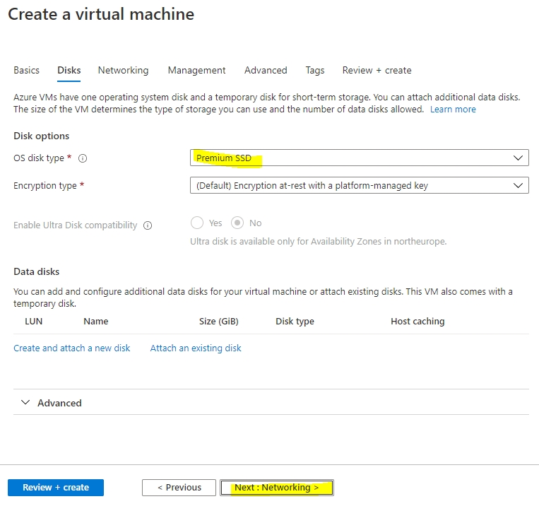 Sélectionnez ensuite : Disks our ensuite configurer les disques de l'instance. Il existe 2 choix pour les disques, soit le SSD Premium qui offre de meilleures performances avec un disque de 64 Go coûte environ 10 $ par mois, soit le SSD standard qui offre des performances inférieures et coûte environ 5 $ par mois. Vous devez également payer 0,002 USD pour 10000 unités de transaction (lectures / écritures et suppressions) avec le SSD Standard, alors qu'avec les SSD Premium, tout est inclus. Personnellement, j'ai choisi le SSD Premium pour de meilleures performances, mais aussi parce que les disques sont susceptibles d'être fortement utilisés et peuvent donc même être moins chers à long terme.