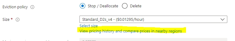 Une fois que vous avez sélectionné la taille de la machine virtuelle, sélectionnez“View pricing history and compare prices in nearby regions” pour voir comment le prix au comptant a changé au cours des 3 derniers mois et s'il est moins coûteux d'utiliser une région voisine qui peut en avoir plus. capacité de réserve.