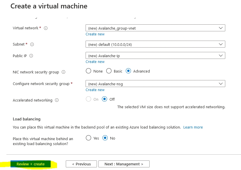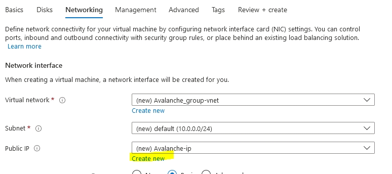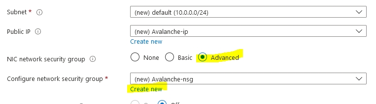 Ensuite, nous devons configurer le groupe de sécurité réseau pour contrôler l'accès entrant au nœud Avalanche. Sélectionnez “Advanced” comme type de groupe de sécurité du réseau NIC et sélectionnez “Create new”
