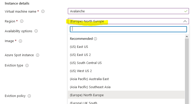 Sélectionnez ensuite une région dans la liste déroulante. Sélectionnez l'une des recommandations recommandées dans la région que vous préférez, car elles ont tendance à être les plus grandes avec la plupart des fonctionnalités activées et des prix moins chers. Dans cet exemple, j'ai sélectionné l'Europe du Nord.