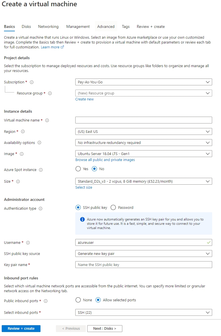 Cela vous mènera à la page Créer une machine virtuelle comme indiqué ci-dessous: