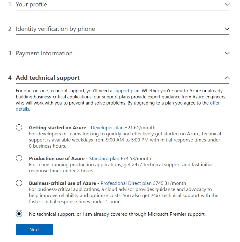 Entrez vos informations de facturation et confirmez votre identité dans le cadre du processus d'inscription, lorsque vous arrivez à Ajouter un support technique, sélectionnez l'option "no technical support" (sauf si vous souhaitez payer un supplément pour l'assistance) et appuyez sur Suivant.