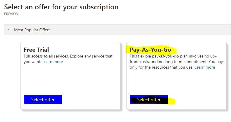 Si vous souhaitez utiliser la tarification de VM Instance Spot (qui sera considérablement moins chère), vous ne pouvez pas utiliser un compte d'essai gratuit (et vous recevrez une erreur lors de la validation), alors assurez-vous de sélectionner Pay-As-You-Go.