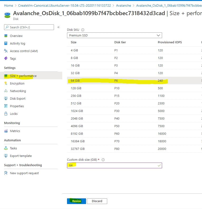 Par défaut, la VM Ubuntu sera provisionnée avec un SSD Premium de 30 Go, alors que cela devrait être suffisant, je ne voulais personnellement pas avoir à le prolonger plus tard dans la période de mise. J'ai inclus les étapes ci-dessous si vous souhaitez l'augmenter à 64 Go ou si vous devez l'augmenter ultérieurement.
