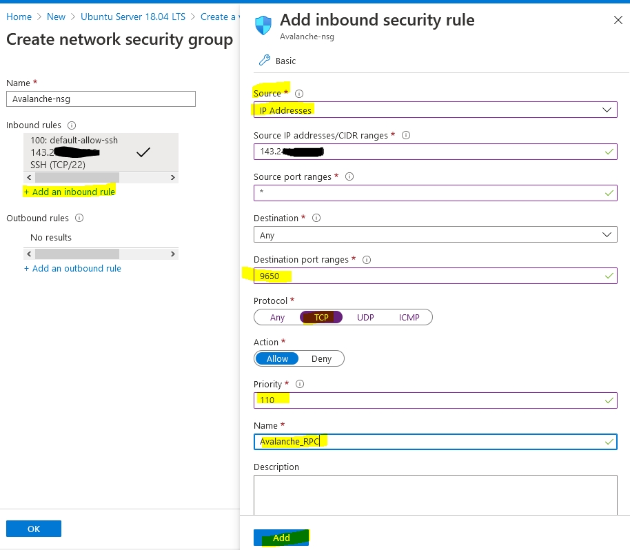 Ensuite, sélectionnez “+ Add an inbound rule” pour ajouter une autre règle pour l'accès RPC, cela devrait également être limité à votre adresse IP uniquement. Remplacez la source par "Adresses IP" et entrez votre adresse IP publique renvoyée par Google dans le champ IP source. Cette fois, changez le champ “Destination port ranges” sur 9650 et sélectionnez “TCP” comme protocole. Changez la priorité à 110 et donnez-lui un nom de “Avalanche_RPC” et appuyez sur "Add".