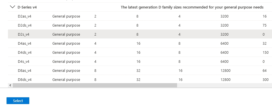 Choisissez “Select size” pour modifier la taille de la machine virtuelle, et dans le menu, sélectionnez D2s_v4 sous la sélection D-Series v4 (cette taille a 2 cœurs, 8 Go de mémoire et active les SSD Premium). Vous pouvez utiliser des instances F2s_v2 à la place, avec 2 cœurs, 4 Go de mémoire et des disques SSD Premium), mais le prix au comptant est en fait moins cher pour la machine virtuelle plus grande actuellement avec des prix d'instance au comptant. Vous pouvez utiliser ce lien pour afficher les prix dans les différentes régions.