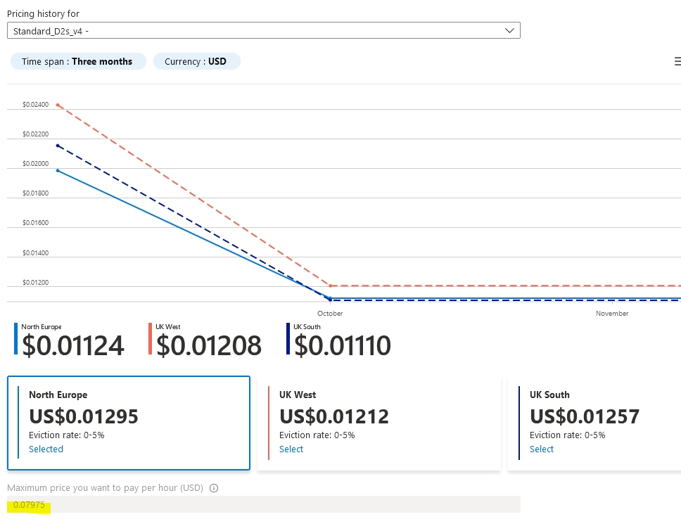 Au moment de cet article, le prix au comptant pour D2s_v4 en Europe du Nord coûte 0,07975 USD par heure, soit environ 698,61 USD par an. Avec les prix au comptant, le prix tombe à 0,01295 $ l'heure, ce qui équivaut à environ 113,44 $ par an, soit une économie de 83,76%!