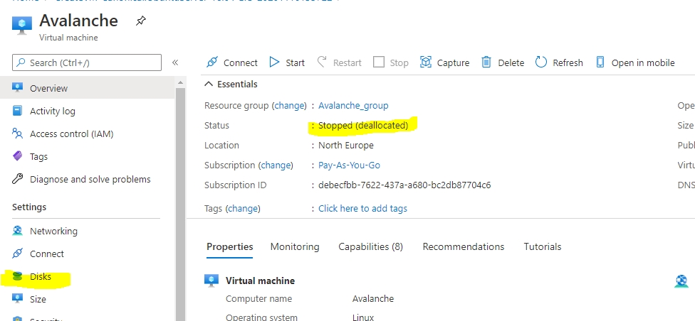Pour modifier la taille du disque, la machine virtuelle doit être arrêtée et désallouée. Sélectionnez “Stop” et attendez que l'état soit deallocated. Sélectionnez ensuite “Disks” sur la gauche.